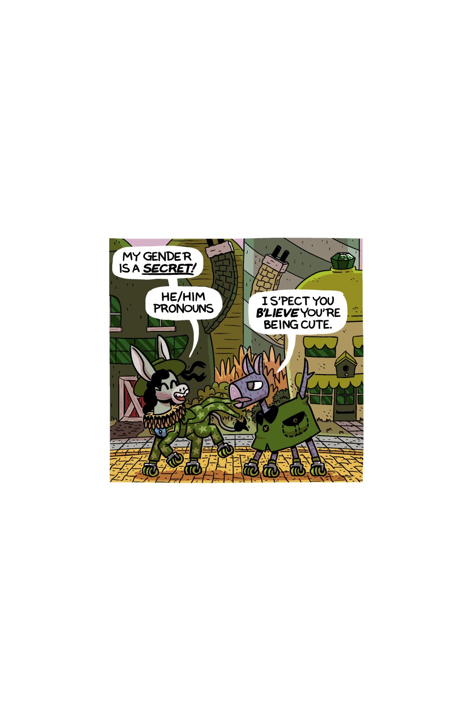 He knows he's being cute. Dashemoff's costume is, of course, that of a Wheeler (from Ozma of Oz), color adjusted for Emerald City.